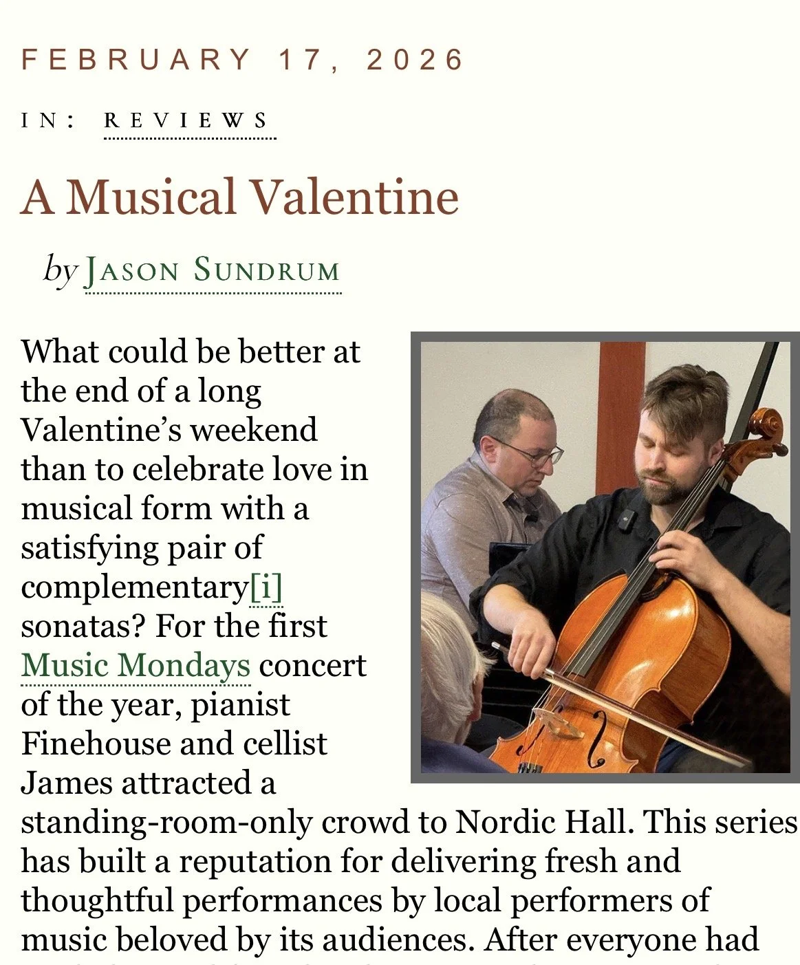“Finehouse and James used a wide palette of timbres to differentiate sections and maintain interest across a movement that can feel labyrinthine. At times the cello whispered with almost painful lightness; at others, Finehouse’s piano lines resonated with thunderous grandeur. The transition into the last movement was masterly, as the innermost sentiment of the Adagio gave way to a boisterous fugue.”